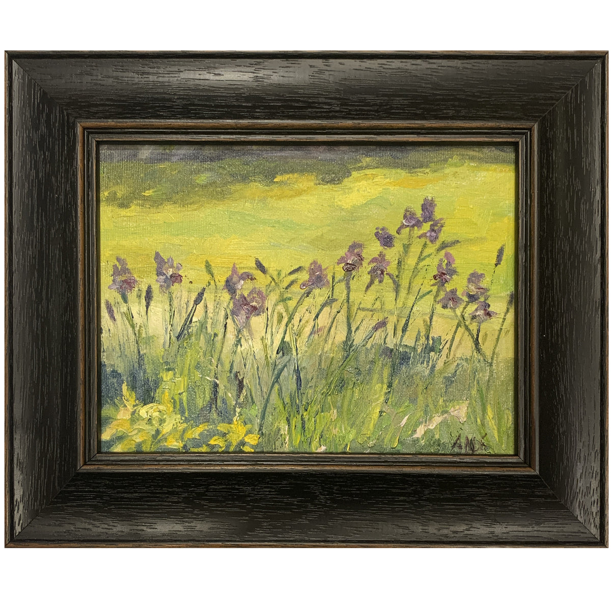 Irises All in a Row, Annette Nicoletti Swanson, Oil on Canvas, Framed