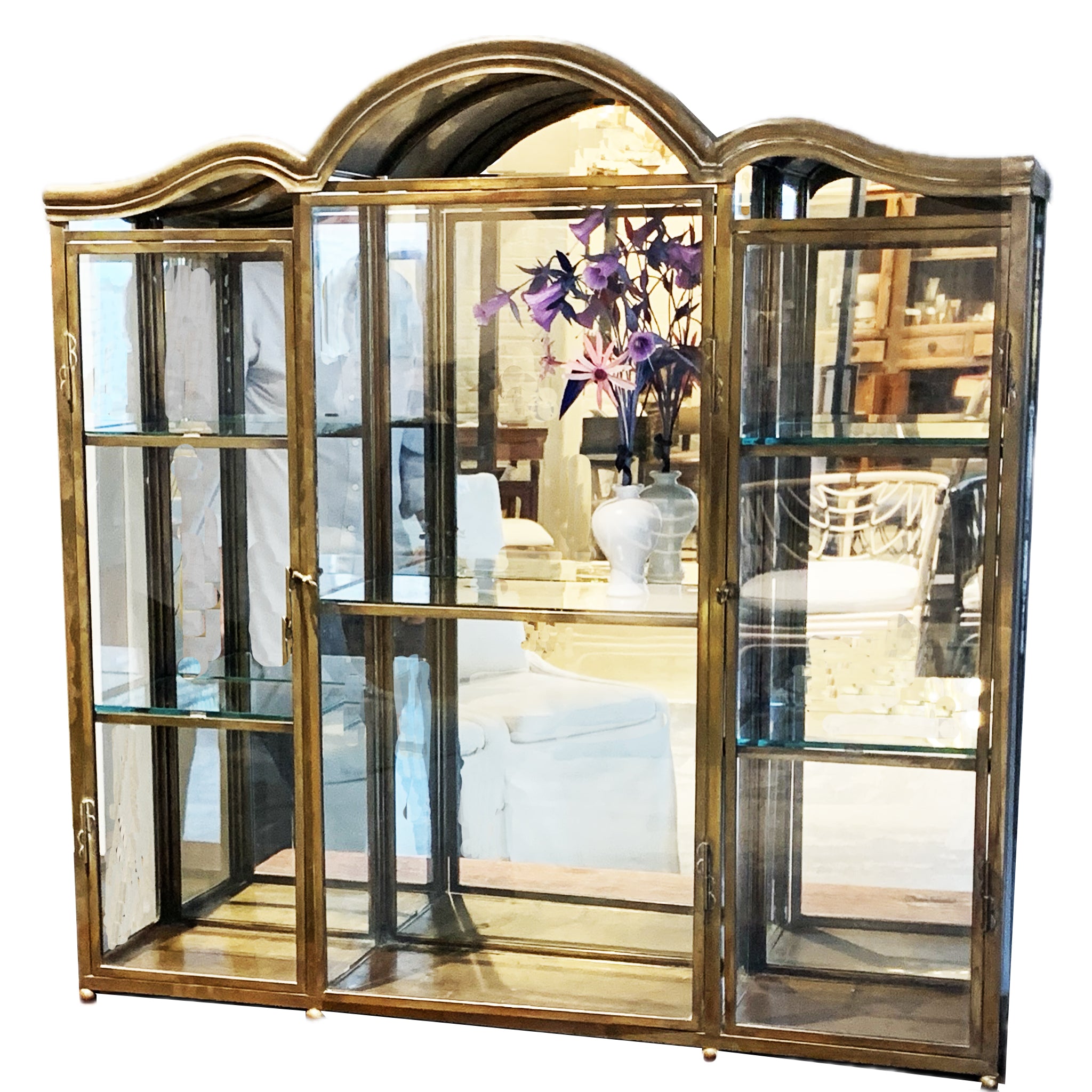 The domed, mirrored back cabinet has 3 sections. The 2 side sections have 2 removable glass shelves and the center section has one removable glass shelf. Made in Italy.