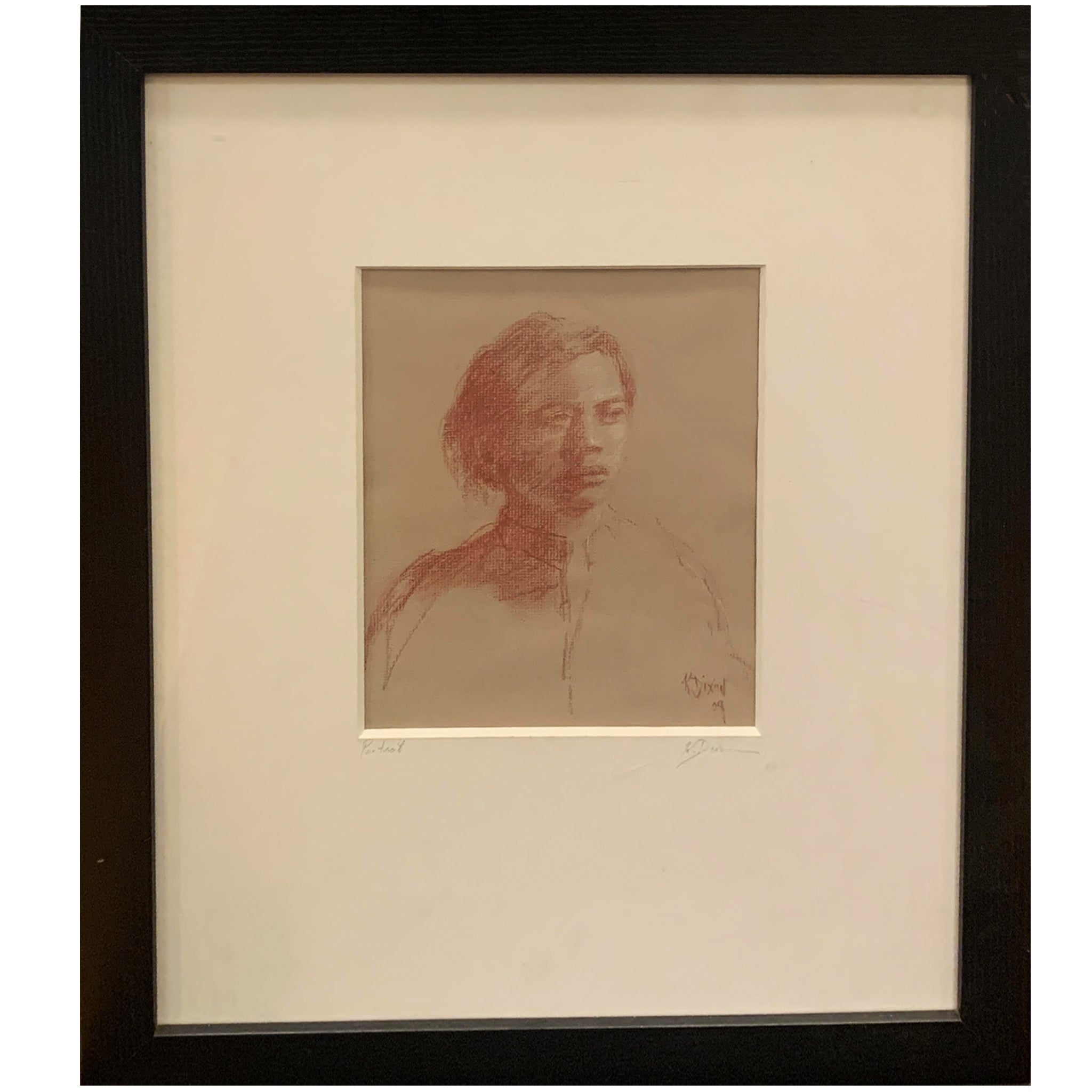 Red Chalk Portrait Drawing of Woman on Paper, Framed, Keith Dixon